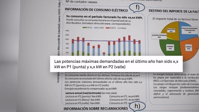 Aquí aparece una gráfica para conocer el consumo mensual de los anteriores 14 meses, que con diferentes colores le permite saber al cliente qué consumo realiza en cada uno de los tres periodos horarios –punta, plan y valle–. Y también un dato muy importante, la potencia máxima demandada durante el último año en cada uno de los dos periodos. Y es que a menudo tenemos una potencia contratada superior a la que necesitamos.