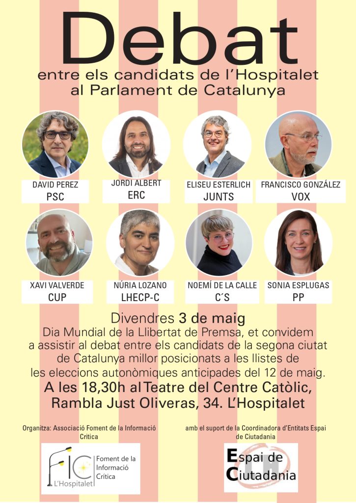 Este próximo viernes 3 de mayo se ha organizado un debate electoral en L’Hospitalet, entre candidatos a las próximas elecciones al Parlament de Catalunya que se celebrarán el próximo 12 de mayo.