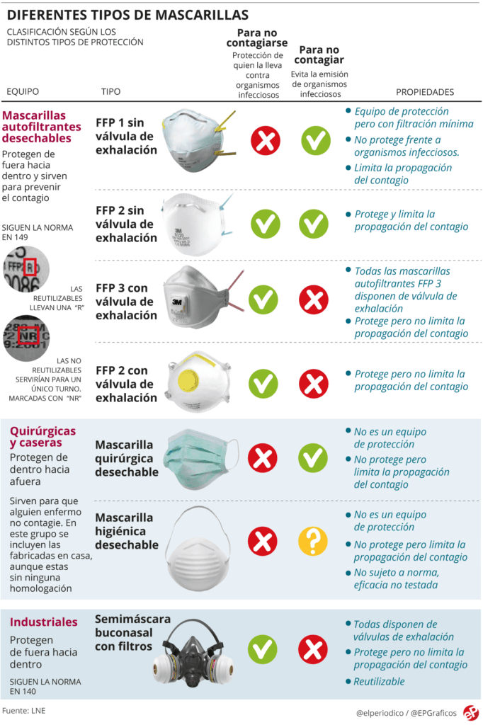 Ante la confusión que existe sobre el tipo de mascarillas, publicamos un documento elaborado por el Ministerio de Trabajo, que esperamos clarifique las dudas. Se distinguen hasta cinco modalidades de mascarillas: Mascarilla con filtro de partículas; Mascarilla autofiltrante o media máscara filtrante contra partículas; Mascarilla quirúrgica; Mascarilla dual; y Mascarilla higiénica