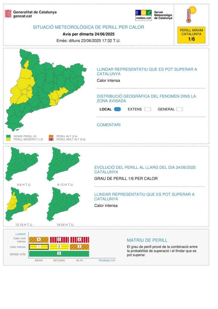 El Servei Metereolòlic de Catalunya ha difundido una alerta avisando de una nueva subida de temperaturas, este martes 24 de junio dia de Sant Joan. Los termómetros en ciudades como L’Hospitalet, Cornellà, Barcelona, y zona sur del Baix Llobregat cercanas a la costa, pueden alcanzar los 36º.
