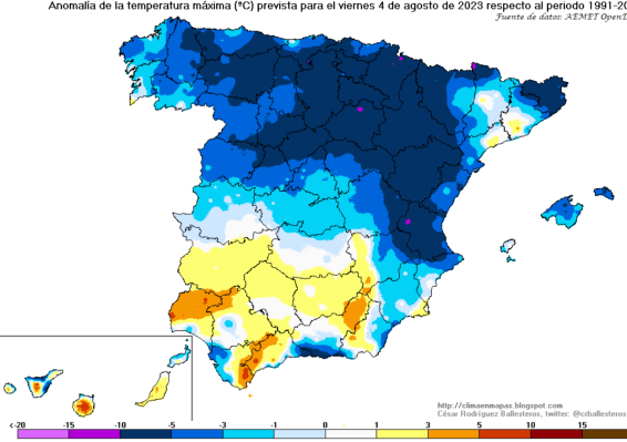 El jueves, la llegada de una masa de aire frío para la época dará lugar a unos tres días con temperaturas inusualmente bajas para agosto, en el norte de la península, en Catalunya, y Baleares: el viernes, los valores diurnos podrían estar entre 5 y 10 °C por debajo de lo normal.