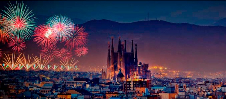 La ciudad de Barcelona tiene la costumbre de acabar el Fin de Año y dar la bienvenida al Año Nuevo con un espectáculo de fuegos artificiales en las Fuentes de Montjuïc, en la avenida Reina Maria Cristina.