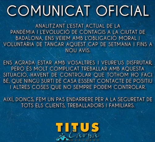“Hacemos un paso atrás por la seguridad de todos los clientes, trabajadores y familiares”, concluye el mensaje de Titus Carpa Badalona. Ni dos semanas han podido tener las puertas abiertas en esta discoteca.