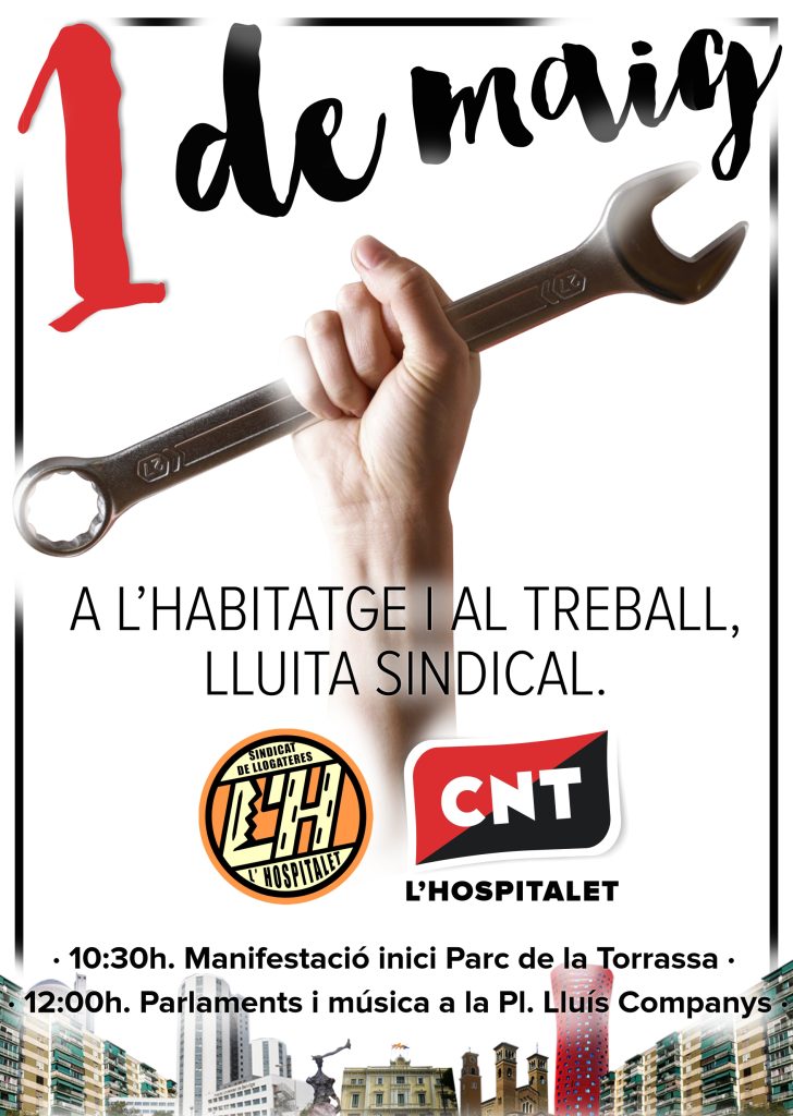 El Sindicat de Llogaters de L’Hospitalet y la CNT se manifestarán por las calles de la ciudad en la conmemoración del 1.º de mayo de este año. La manifestación reivindicativa partirá del parc de la Torrassa a las 10:30 h y recorrerá las calles de los barrios de Sant Josep y Centre, hasta llegar a la Plaza Lluís Companys, a la altura de la Rambla Marina. En este punto, hacia las 12 h se harán parlamentos y una pequeña actuación musical.