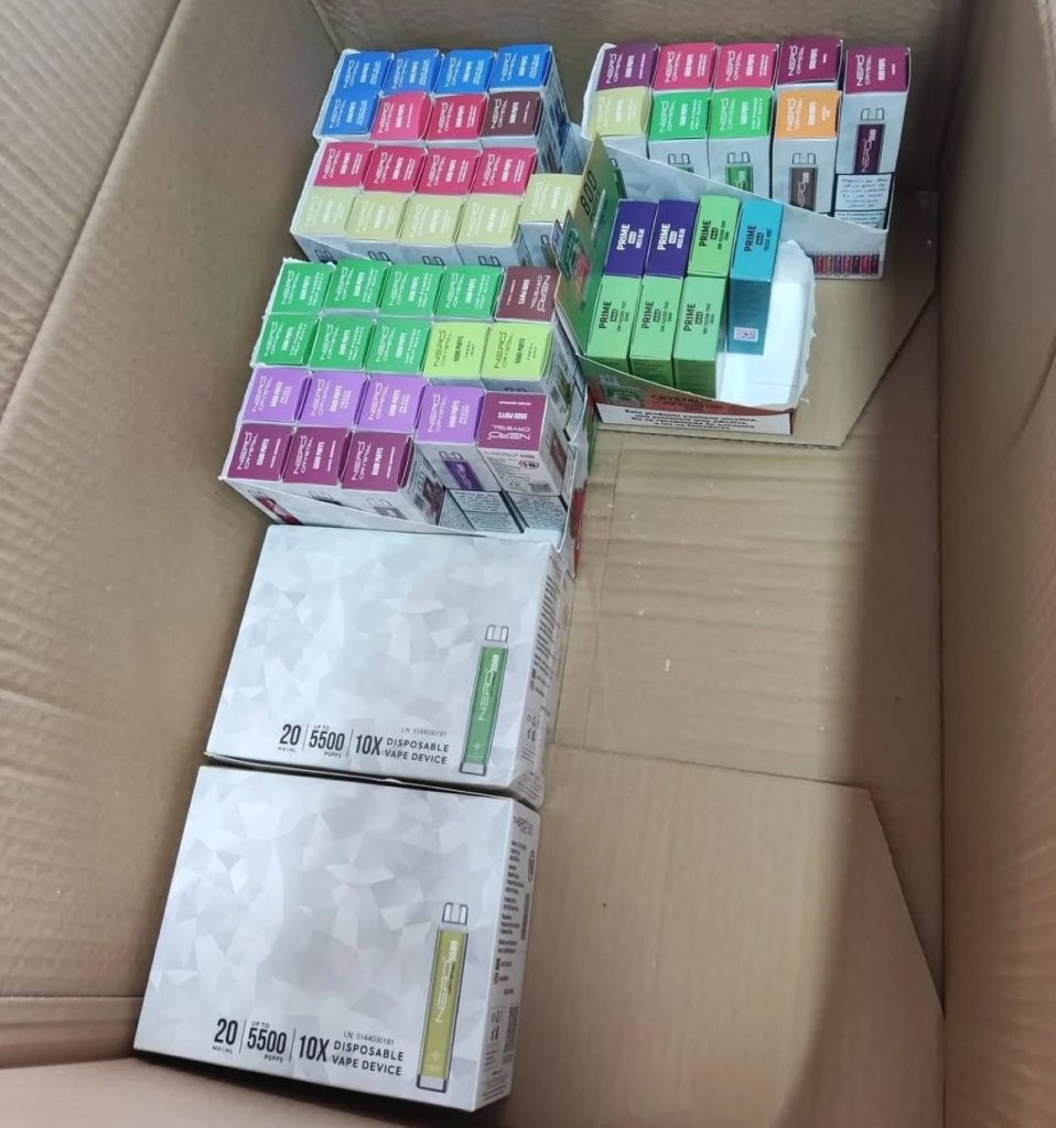 Durante la actuación se levantó acta de inspección y se procedió al precinto de material, entre el cual habían: 79 vapeadores, 10 cajas de preservativos y productos alimentarios.