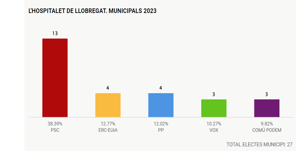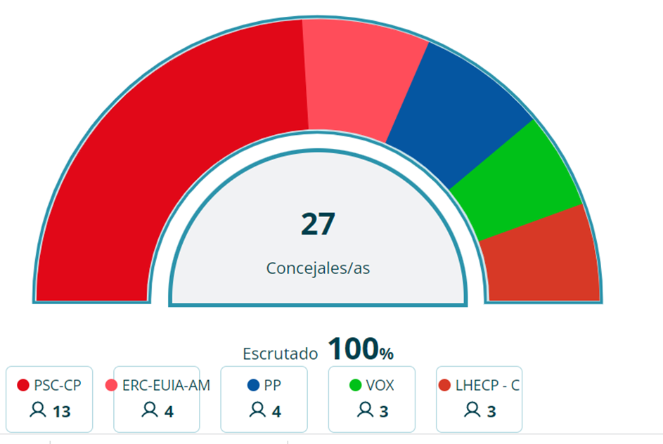 A continuación les detallamos los resultados electorales en la ciudad de L’Hospitalet, correspondientes a las elecciones del 28 de mayo:
