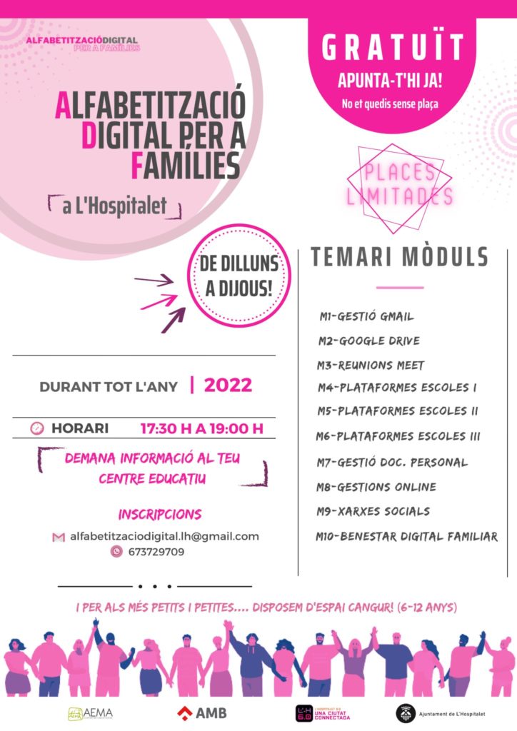 El Ayuntamiento de L’Hospitalet, pone en marcha el proyecto Alfabetización digital para familias, un programa formativo que se desarrollará a partir del 14 de febrero y durante todo el año. El proyecto, subvencionado por el Área Metropolitana de Barcelona y que se desarrolla a través de la entidad AEMA, nace para dar respuesta a las necesidades de las familias para poder acompañar a sus hijos e hijas en su día a día y en relación con el ámbito digital.
