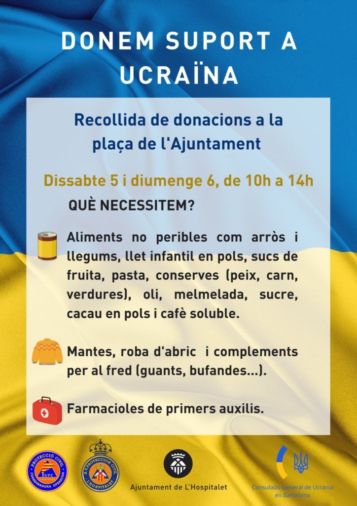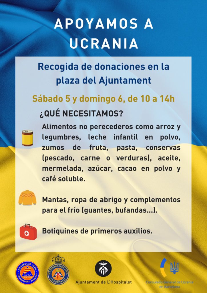 El Ayuntamiento de L’Hospitalet, a través de Protección Civil de L’Hospitalet y del Consulado General de Ucrania en Barcelona, organiza el sábado y domingo, 5 y 6 de marzo, la campaña Damos apoyo a Ucrania.