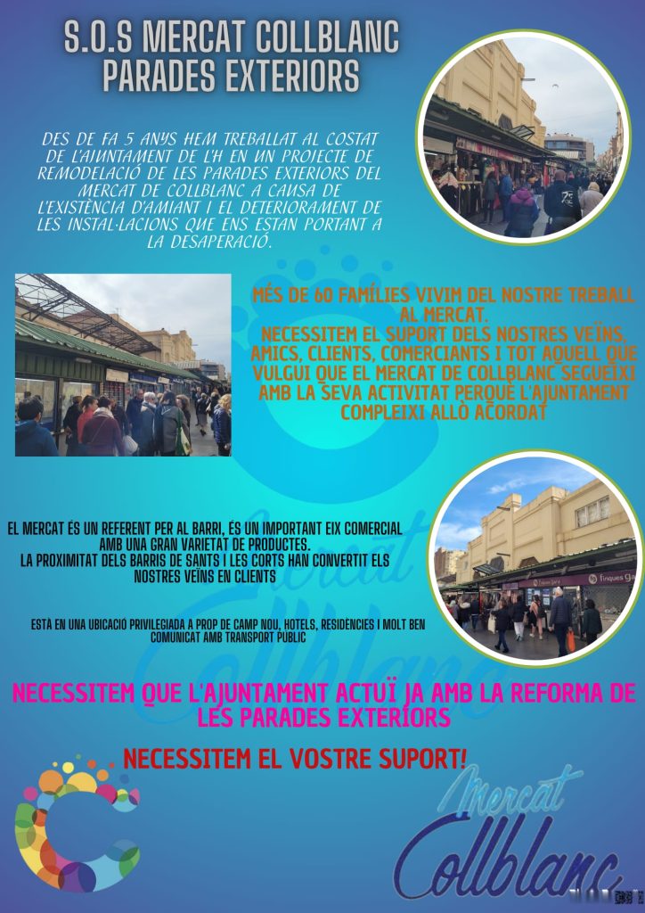 Hace pocos día los paradistas del Mercado exterior de Collblanc se reunieron con el concejal J. A. Alcaide y la Regidora del distrito de Collblanc Olga Gómez, en este encuentro los representantes municipales confirmaron que por el momento no hay fecha para empezar las obras de remodelación del Mercado, aunque continúan trabajando en el proyecto de reforma, según el comunicado difundido por los parodistas.
