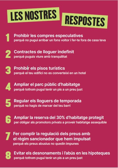 Miembros de la organización local y los tres concejales de Comuns en el Ayuntamiento han dado a conocer las propuestas a diferentes puntos de la ciudad, donde han repartido folletines informativos. Entre las acciones planteadas se destaca gravar las compras especulativas, regular los contratos de temporada o aplicar el régimen sancionador que los Comuns han pactado con el Govern de la Generalitat.