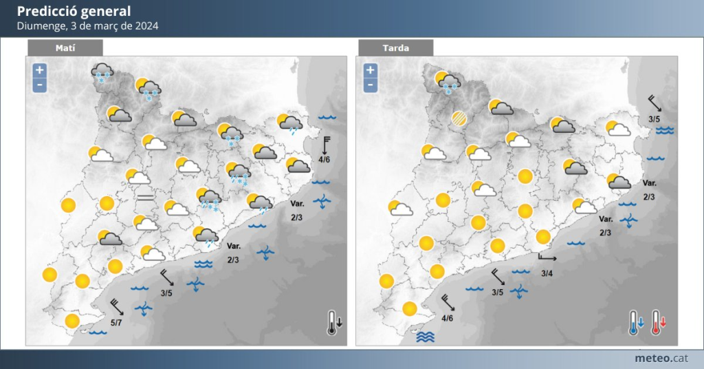 El cielo cambiante ha sido el protagonista durante el día, en el Pirineo de Lleida, las precipitaciones de nieve han sido persistentes, y más débiles en el Pirineo de Girona. La cota de nieve ronda los 1.200 metros.