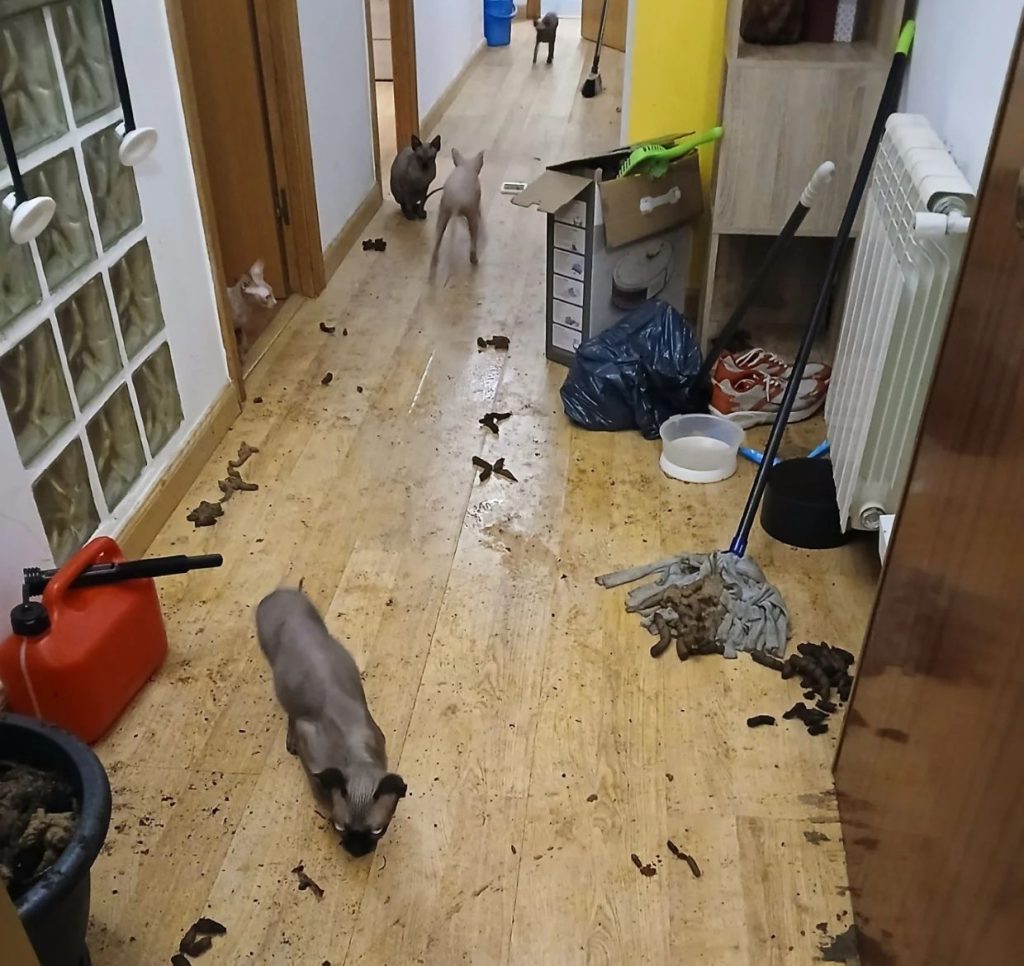 En el interior se localizaron 6 gatos de raza Sphynx en una situación muy preocupante: sin agua, y con signos evidentes de desatención. Ante estos hechos, se activó inmediatamente la protectora local, que se hizo cargo de los animales para garantizar el bienestar y su recuperación.