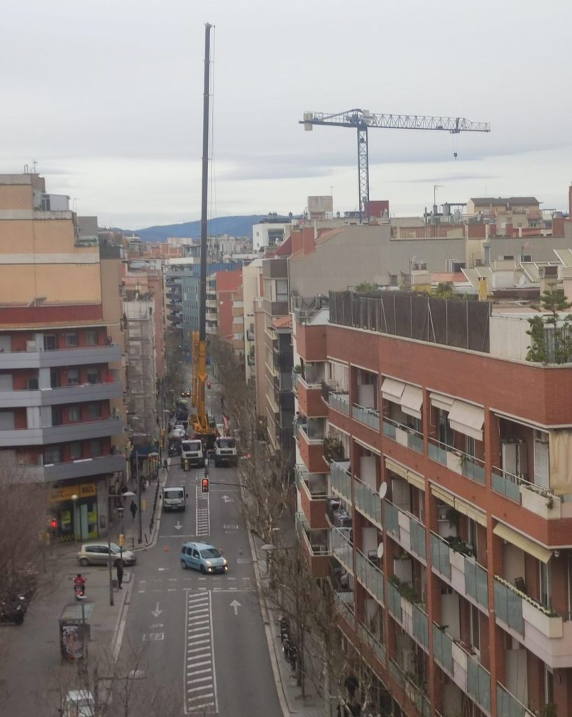 La instalación de una grúa de grandes dimensiones en la carretera de Santa Eulàlia de L’Hospitalet, esta mañana de domingo, ha provocado un corte de circulación en la vía, y ha obligado a diferentes líneas de Bus a desviar sus recorridos.