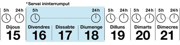 Los trenes circularán desde las 5 de la madrugada de viernes, 16 de agosto, hasta las 12 de la noche del día 18 (es decir, hasta la finalización del servicio de domingo). Todo ello favorecerá la movilidad en transporte público.