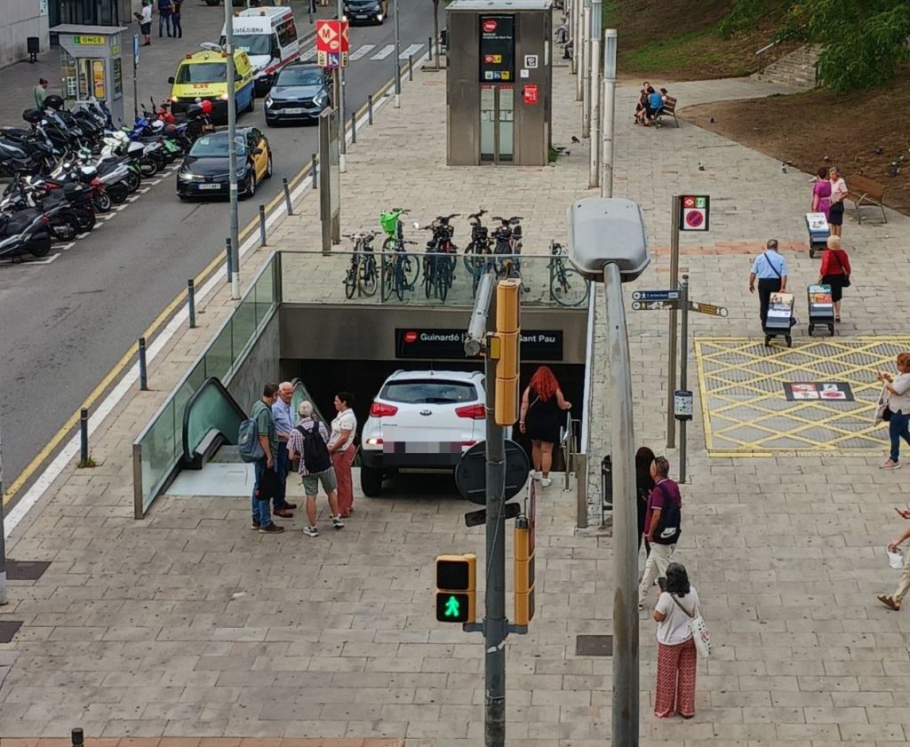 Un coche queda atrapado en las escaleras de la entrada de una estación del metro de Barcelona