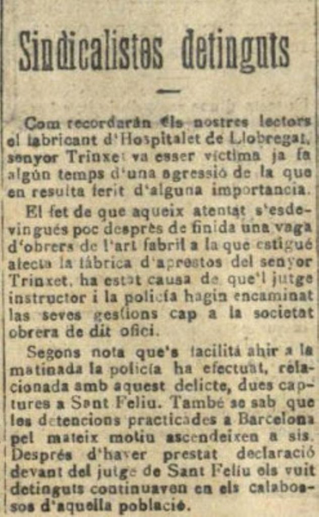 – El atentado contra Antoni Trinxet, en el que murió su cochero, Antoni Esquirol, el 30 de noviembre del 1917, en la carretera de la Bordeta.
