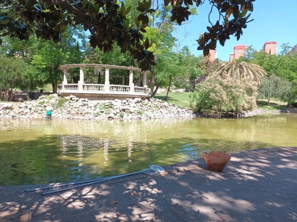 Las previsiones meteorológicas apuntan a una subida de las temperaturas a lo largo de la semana, se agradece la presencia del agua en el estanque, una visión que ayuda a crear un ambiente más fresco, y agradable a los ciudadanos que pasean, o se tumban en la hierba en la ladera cercana al lago.