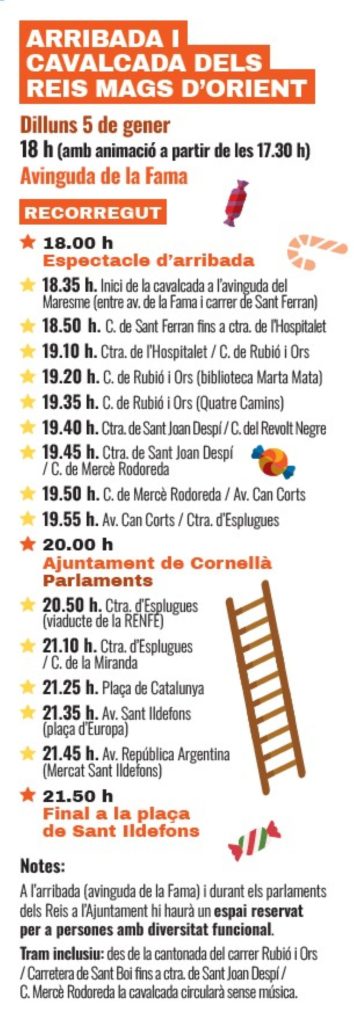 Cornellà recibirá la visita de Sus Majestades los Reyes Magos el lunes 5 de enero, a las 18 h, en la avenida de la Fama, con animación previa a partir de las 17.30 h.