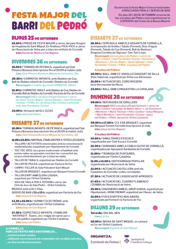 El barrio del Pedró en Cornellà celebra sus fiestas de barrio durante el último fin de semana de septiembre, coincidiendo, como es habitual, con la conmemoración de su patrón Sant Miquel (29 de septiembre). De esta forma, durante todo este fin de semana, habrá diferentes propuestas lúdicas para todas las edades. El objetivo no es otro que presentar la variedad asociativa de este distrito y dar a conocer la diversidad de propuestas de ocio y cultura que se pueden disfrutar en esta zona de Cornellà.