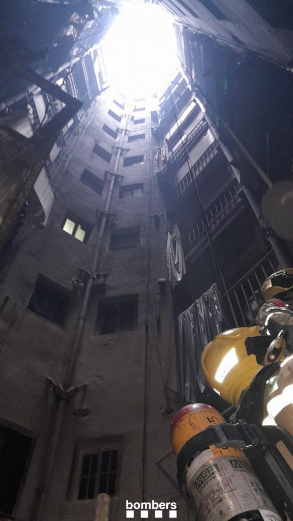 Parece ser que un patinete que se encontraba en el patio de luces del interior del edificio ha explosionado y ha provocado un incendio, con una fuerte carga de humo.