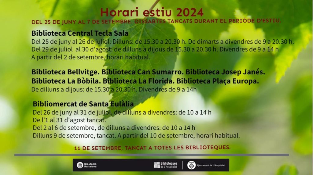 Entre el 25 de junio y el 7 de septiembre, las bibliotecas de L’Hospitalet modifican sus horarios. Las bibliotecas cerrarán el 15 de agosto y el 11 y el 24 de septiembre y los sábados durante este periodo de verano. El Bibliomercat de Santa Eulàlia permanecerá cerrado del 1 al 31 de agosto.