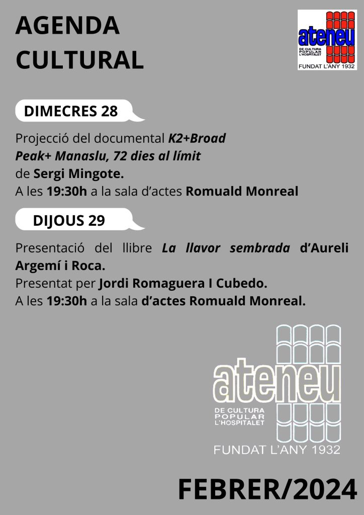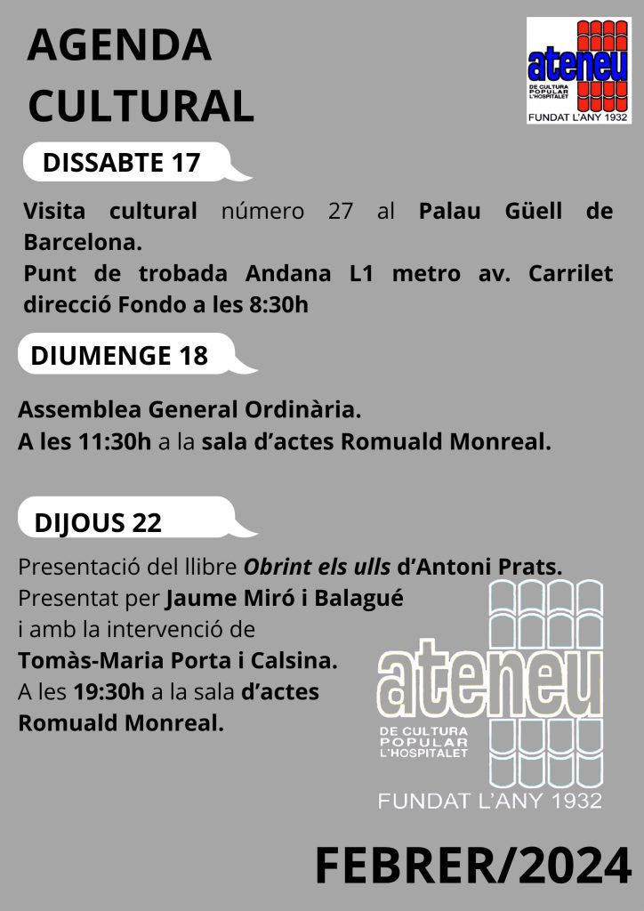 Cultura L’Ateneu de Cultura Popular de L’Hospitalet, ens presenta les activitats del mes de febrer . FOTOGRAFIA MONTSERRAT GARCIA BALAGUE Redacción 31/01/2024 Etiquetas Ateneu de Cultura Popular de L'HospitaletCulturaLHL'Hospitalet