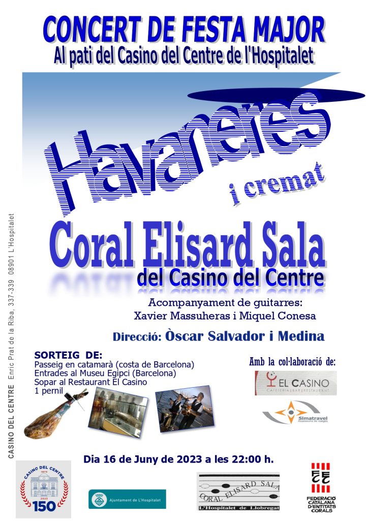 El pròxim divendres 16 de juny podreu gaudir d’un Concert d’Havaneres, al pati del Casino del Centre de L’Hospitalet, acompanyat d’un bon cremat, dins dels actes de la Festa Major del Centre 2023.