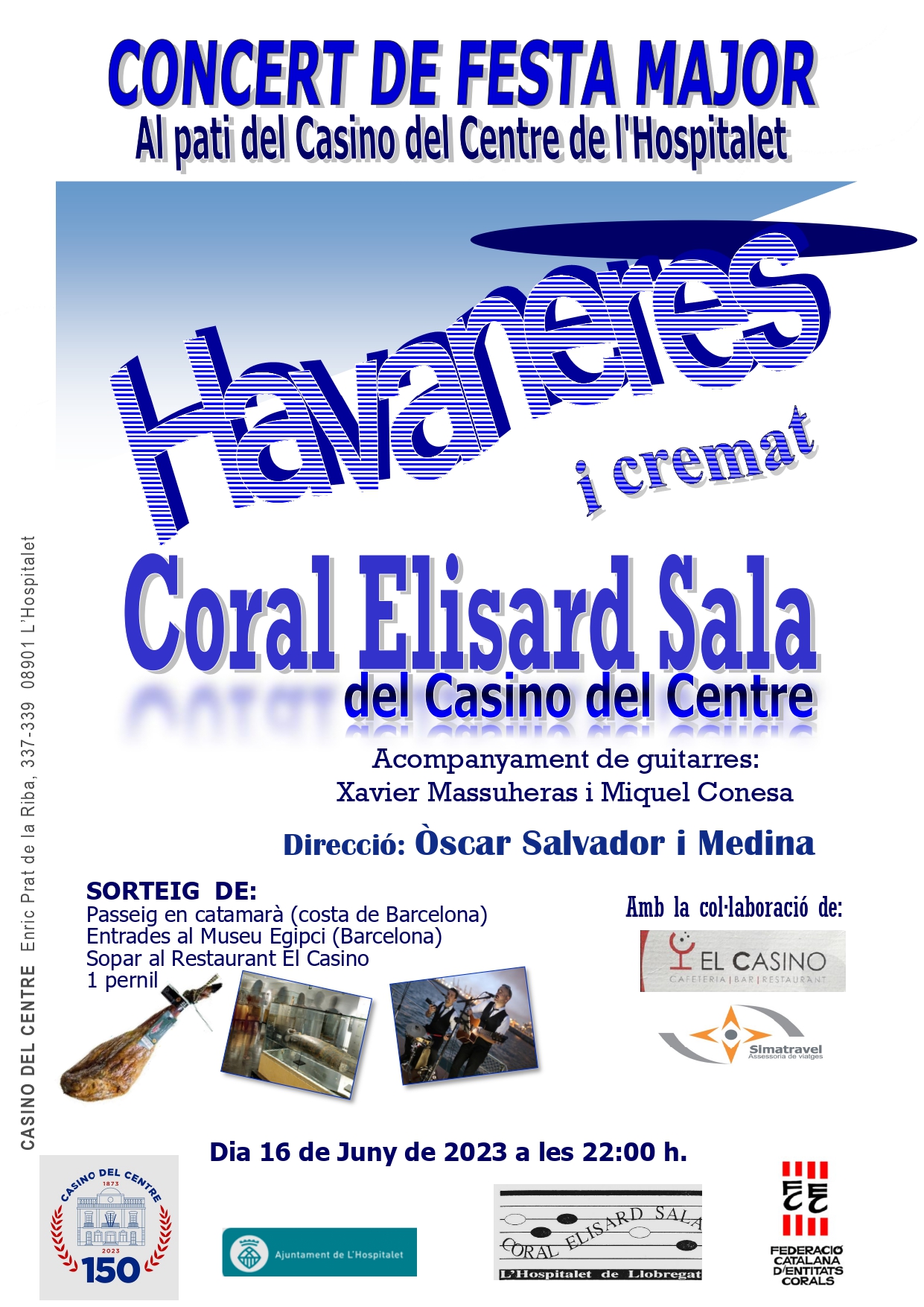 El pròxim divendres 16 de juny podreu gaudir d’un Concert d’Havaneres, al pati del Casino del Centre de L’Hospitalet, acompanyat d’un bon cremat, dins dels actes de la Festa Major del Centre 2023.