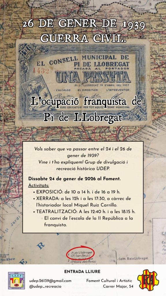 Este sábado 24 de enero organizado por el Grup de divulgació i recreació histórica (UDEP), y el Foment Cultural i Artístic, se ha preparado una jornada de recuerdo al que fue el último día de Sant Joan Despí bajo el régimen de la Republica, -recordemos que en aquel momento la ciudad se llamaba Pi de Llobregat-, y la entrada de las tropas franquistas en el municipio.