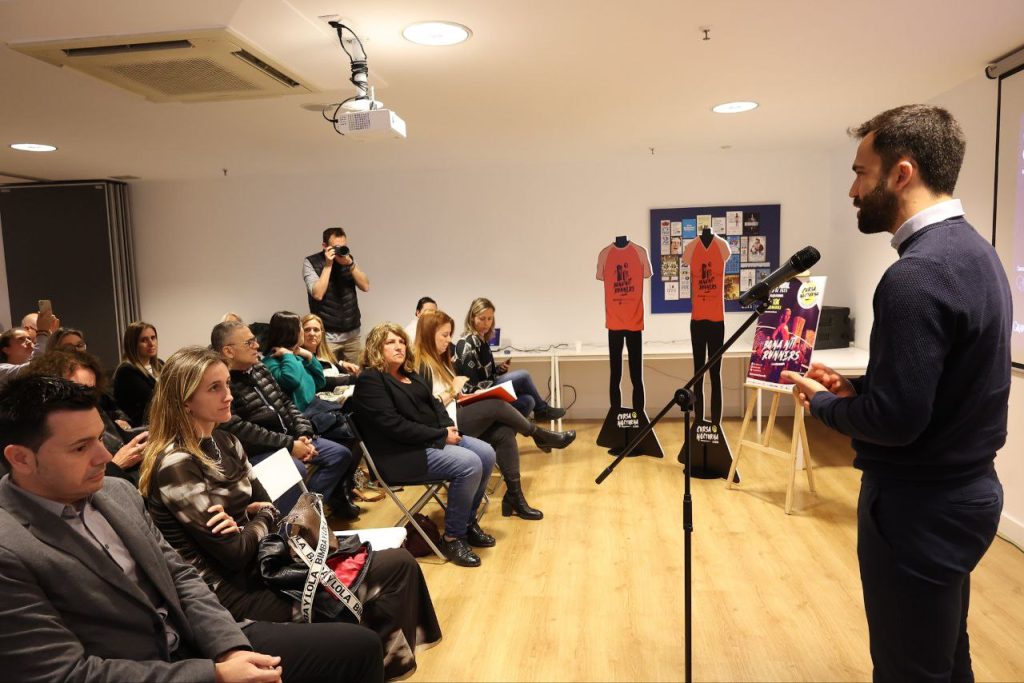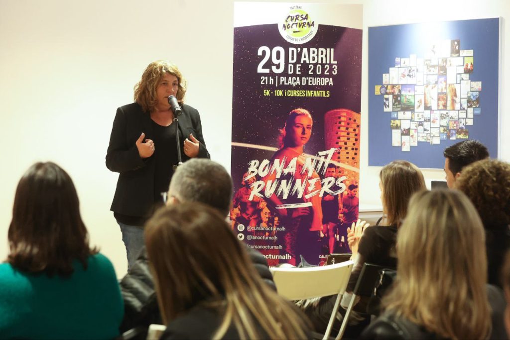 La concejala de Deportes, Maite Revilla, la responsable de iniciativas solidarias y alianzas corporativas de la Fundación Josep Carreras, Regina Díez, y representantes de las empresas patrocinadoras han participado este martes en la presentación de la próxima cita de la Cursa Nocturna de L’Hospitalet.