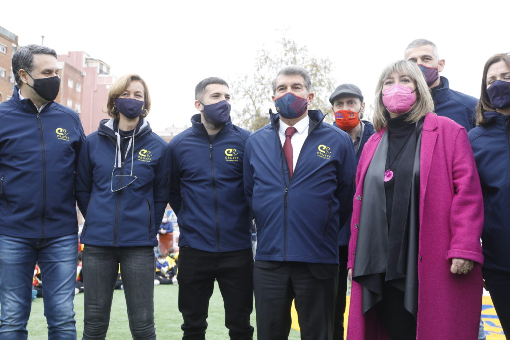 El jugador del FC Barcelona, Jordi Alba; la directora de la Fundación Cruyff, Pati Roura; el director corporativo de Educación y Marketing de la Fundación «la Caixa», Xavier Bertolín; el presidente del FC Barcelona y de la Fundación Barça, Joan Laporta, y la alcaldesa de L’Hospitalet, Núria Marín, han presentado hoy el Cruyff Court Jordi Alba con la intención de promover el deporte entre los niños y jóvenes de la localidad.