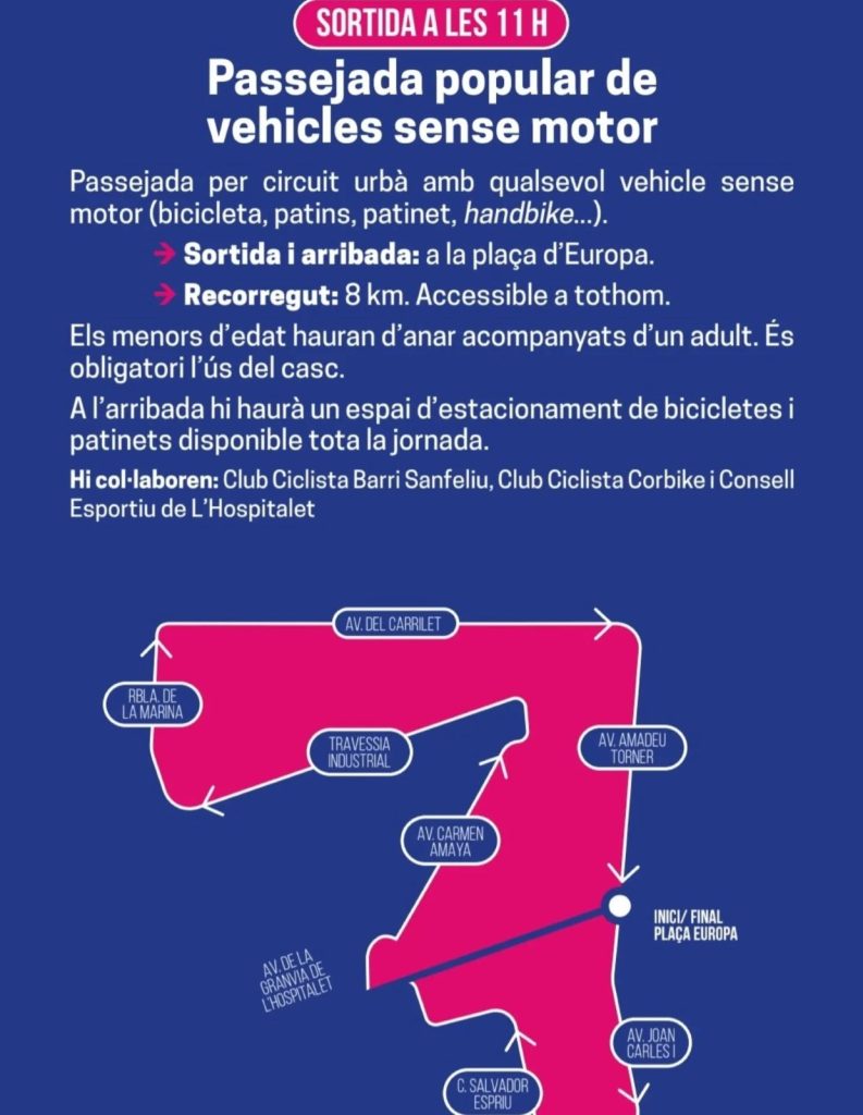 A la llegada habrá un espacio de estacionamiento de bicicletas y patinetes, para que los participantes puedan continuar disfrutando de las actividades durante el resto de la mañana. La actividad se realiza con la colaboración de Club Ciclista Barrio Sanfeliu, Club Ciclista Corbike y Consejo Deportivo de L’Hospitalet.
