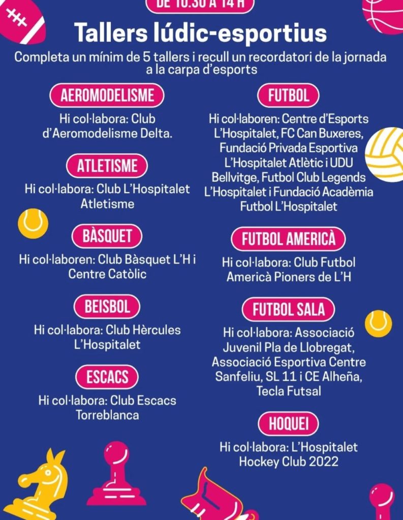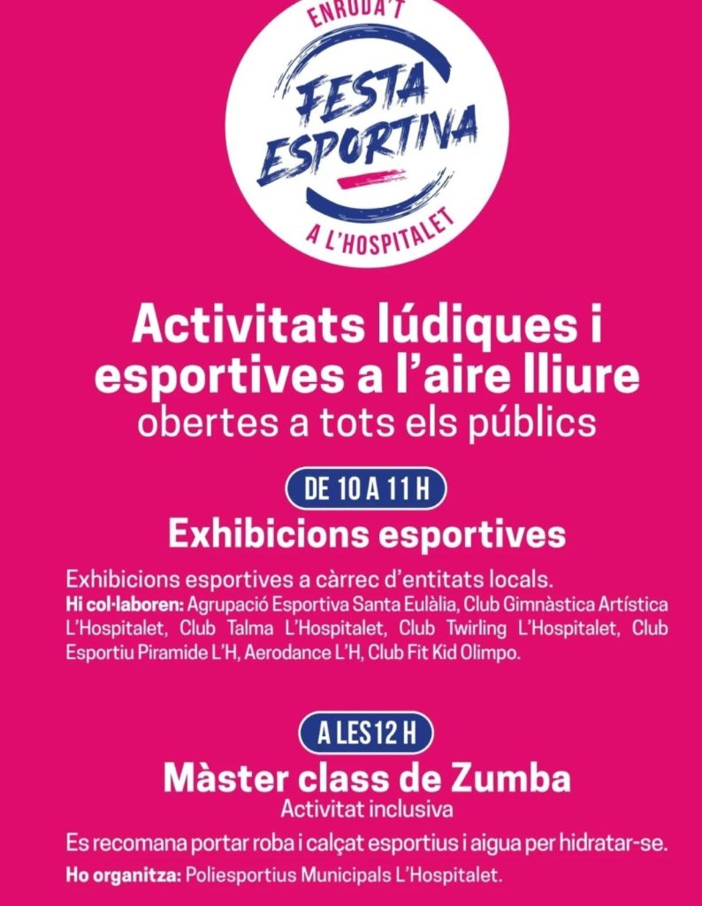 Las exhibiciones deportivas empezarán a las 10 horas y estarán a cargo de Agrupación Deportiva Santa Eulalia, Club Gimnasia Artística L’Hospitalet, Club Talma L’Hospitalet, Club Twirling L’Hospitalet, Club Deportivo Pirámide, Aerodance LH y Club Fit Kid Olimpo.