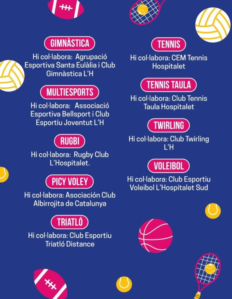 Fútbol, con el Centro de Deportes L’Hospitalet, la Fundación Privada Deportiva L’Hospitalet Atlético, el Fútbol Club Can Buxeres, el UDU Bellvitge, el Fútbol Club Legends L’Hospitalet y la Fundación Academia Fútbol L’Hospitalet.