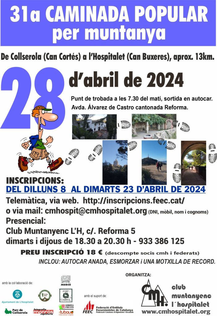 La Caminada Popular arriba a la seva 31 edició. Aquest diumenge 28 d’abril, organitzada pel Club Muntanyenc de L’Hospitalet. Recorregut de Collserola a L’Hospitalet.