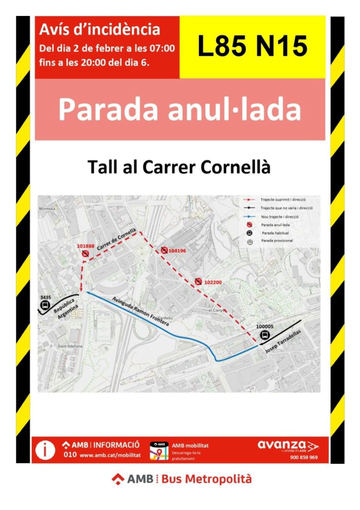 · Corte en la calle de 𝗖𝗼𝗿𝗻𝗲𝗹𝗹𝗮̀ con afectaciones a los buses L20, L21, L85 y N15.