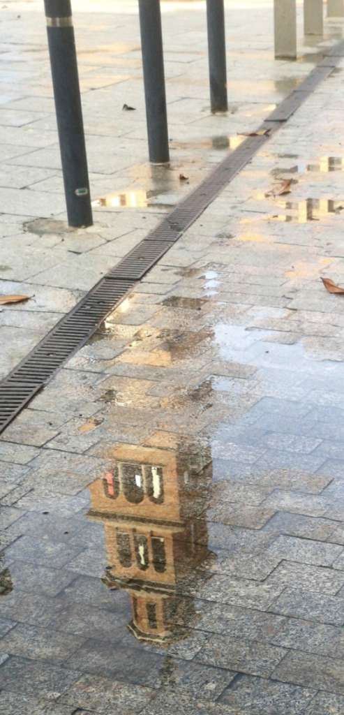 Cuando la lluvia se deja ver en la plaza del Ayuntamiento de L’Hospitalet de Llobregat, se refleja la iglesia de Santa Eulalia de Mèrida en los mosaicos de la misma plaza y en la de Mossen Homar, tal y como se aprecia en esta imagen en Las Fotos de los Lectores de La Vanguardia. La imagen fue publicada en la Vanguardia el pasado 3 de diciembre. La fotografía está hecha por Fernando Monfort.
