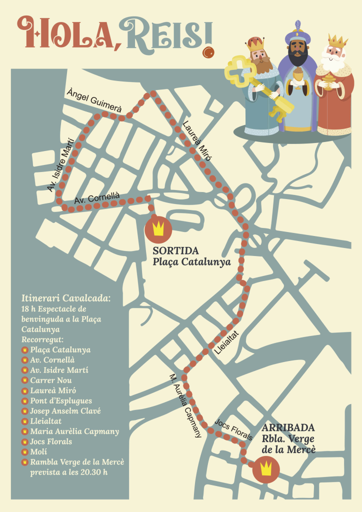 Recorrido de la Cabalgata: Plaza Cataluña – Avda. Cornellà – Avda. Isidre Martí – Carrer Nou – Laureà Miró – Pont d’Esplugues – Josep Anselm Clavé – Lleialtat – Maria Aurèlia Capmany – Jocs Florals – Molí – Rambla Verge de la Mercè (llegada prevista a las 20.30 h). Consulta las afectaciones al tráfico y estacionamiento de vehículos debido a la Cabalgata.