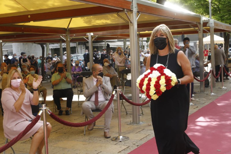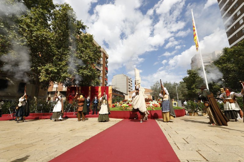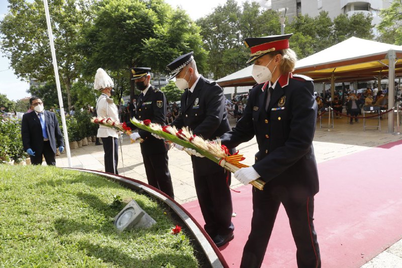 A continuació, s’ha fet davant de l’escultura de Rafael Casanova l’homenatge a la senyera,  que ha donat pas a l’ofrena floral, en la qual han participat entitats i col·lectius d’àmbit ciutadà, formacions polítiques i sindicals, forces de seguretat i representants dels grups municipals, entre d’altres. Acabada l’ofrena, s’ha cantat Els segadors, amb l’acompanyament de tots els assistents.