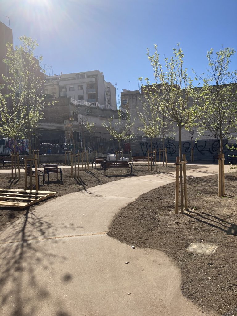 En el espacio que se han plantado árboles de especies de hoja caduca y perennes que con el tiempo tienen que aportar mucha sombra. El jardin tiene tierra vegetal de crecimiento espontáneo. Se inscribe en el proceso de recuperación de pequeños espacios verdes de proximidad de L’Hospitalet para uso ciudadano. El proyecto, cofinanciado con los fondos europeos Next Generation, ha sido acordado con el vecindario y formará parte de la red de islas bosque de la ciudad. Esta nueva zona verde, de 740 m2, da respuesta a la necesidad de recuperar el espacio del actual solar, tal como pide el vecindario.