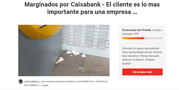 En el pasado mes de diciembre CaixaBank, cerró la única oficina bancaria que aun quedaba abierta en el barrio del Gornal de L’Hospitalet. Este cierre obliga a los vecinos y vecinas a desplazarse hasta el barrio de Bellvitge para poder realizar las gestiones bancarias. Un desplazamiento que no es nada fácil para las personas de más edad.