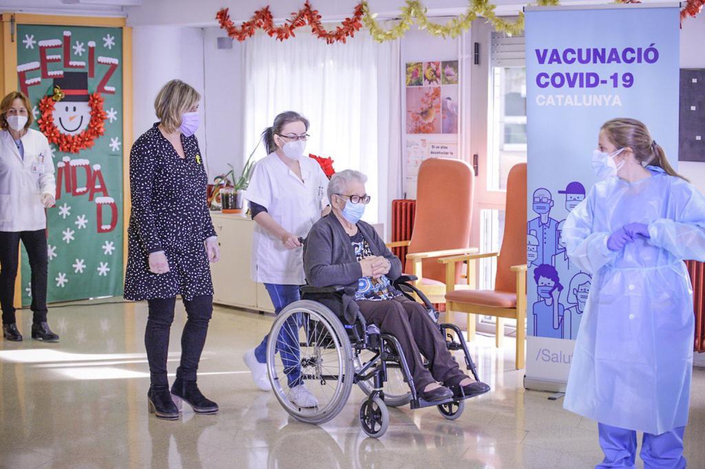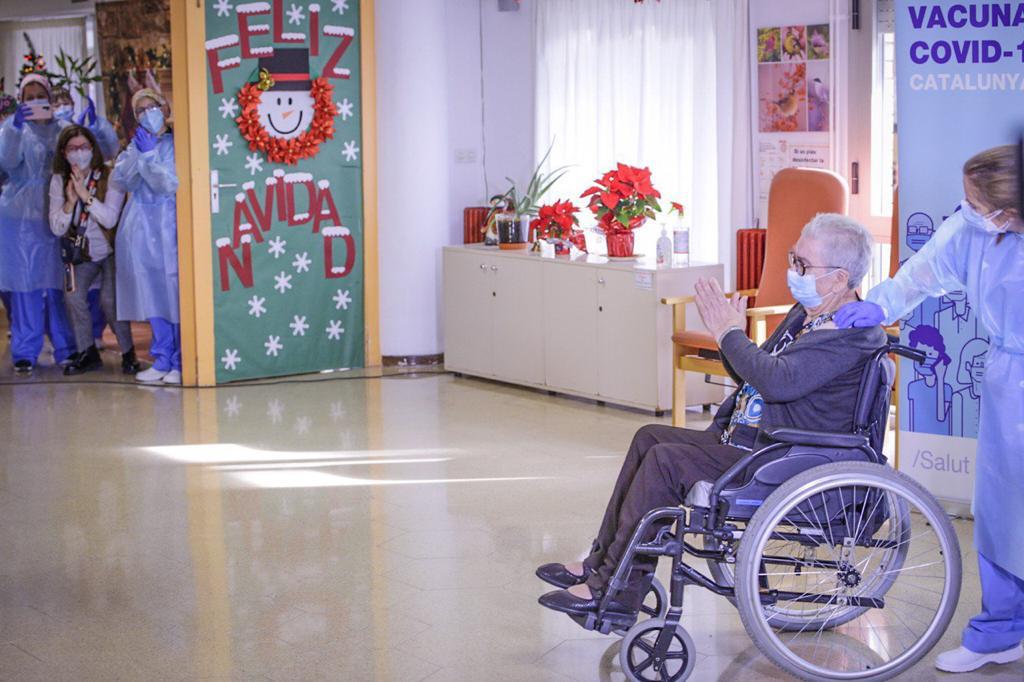 A las 12 h. del mediodía de este domingo, y entre fuertes aplausos, el personal sanitario desplazado a la Residencia Feixa Larga ha suministrado la primera dosis de la vacuna a Josefa Pérez.