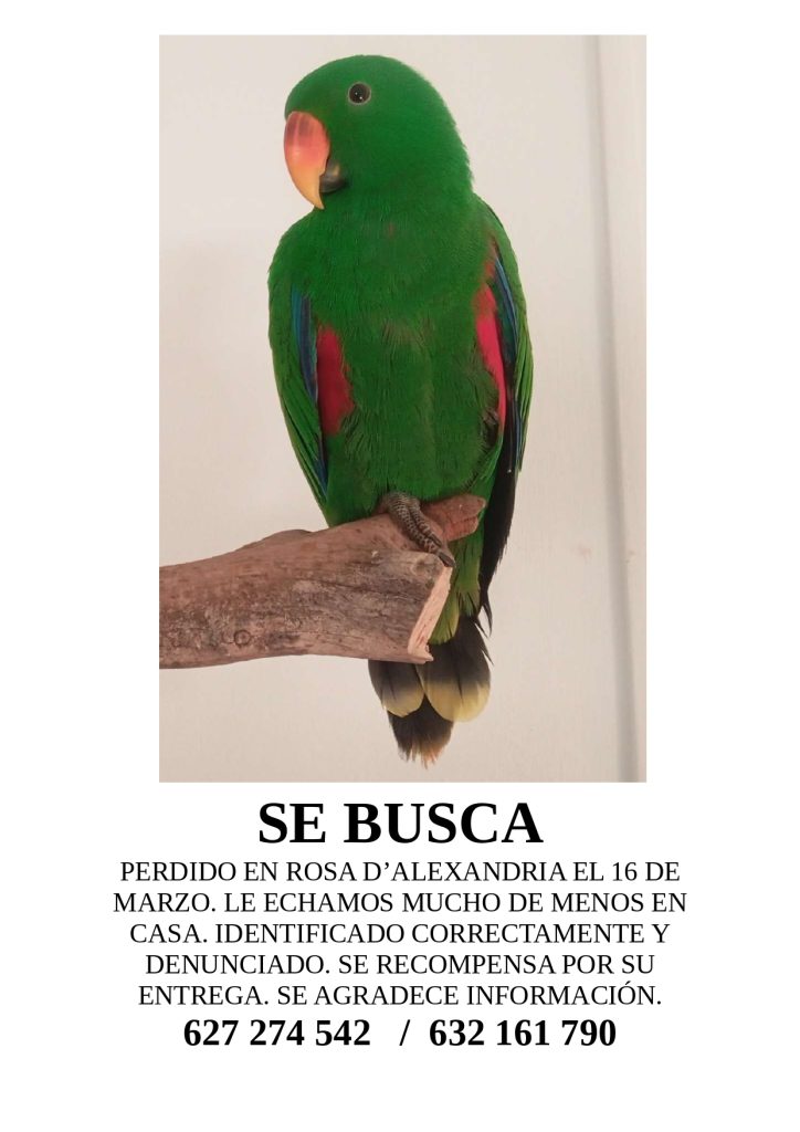Hola, el 16 de marzo se nos escapó un loro eclectus en Rosa d’Alexandria de L’Hospitalet de Llobregat. Andamos locos buscándolo porque es nuestra vida. Tengo su documentación. Ruego la máxima difusión, por favor. Adjunto el cartel.