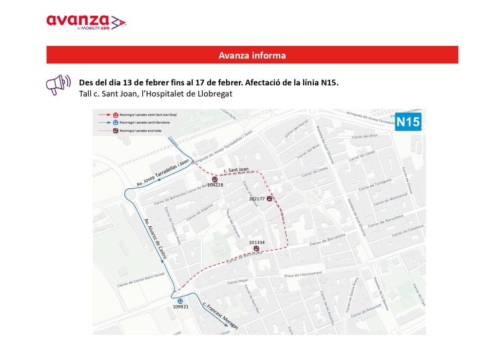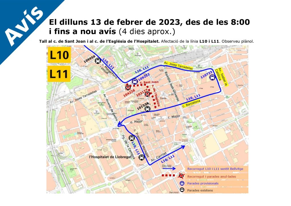 Este lunes 13 de febrero las líneas de Bus L10, L11 y N15 cambian su recorrido habitual a causa de un corte de circulación en el Carrer de Sant Joan i Carrer de l’Església, en en barrio de L’Hospitalet Centre.