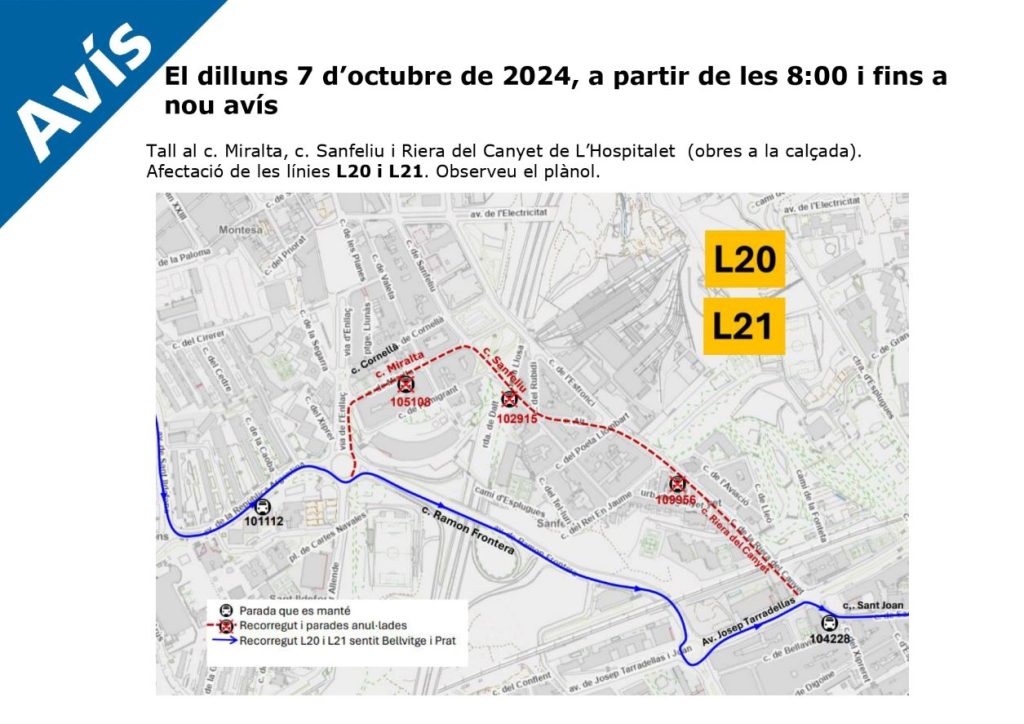 Las líneas de bus L20 y L21 cambian su recorrido por un corte en las calles de Miralta, Sanfeliu y Riera del Canyet por obras a la calzada.
