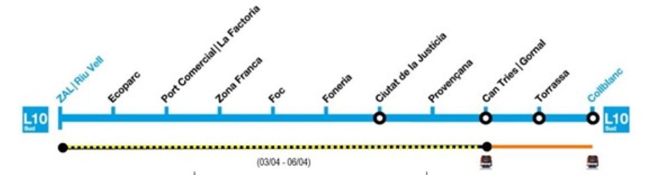 El tramo de la Línea 10 sur del metro de Barcelona comprendido entre las estaciones de ZAL/Riu Vell y Can Tries/Gornal estará fuera de servicio entre el 3 y el 6 de abril por obras de actualización de la señalización de la línea. Estos trabajos, que se ejecutarán coincidiendo con el período de Semana Santa , se enmarcan dentro del conjunto de medidas que se están desplegando para optimizar las condiciones de explotación del trazado y reforzar la fiabilidad del servicio. Los trabajos serán ejecutados por la Generalitat a través de la empresa púbica Infraestructuras de la Generalitat (ICAT) y cuentan con una inversión global de 3.498.000€.