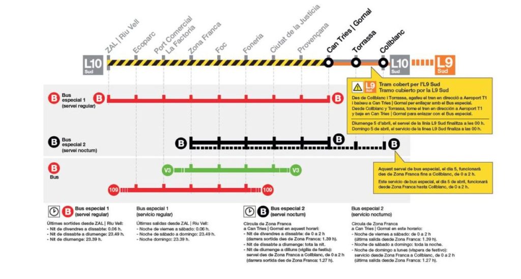 La noche del domingo 5 de abril, y por cuestiones técnicas relacionadas con el corte, el servicio de la L9Sud finalizará a las 00:00 horas en lugar de las 02:00. Esta afectación será cubierta también con 8 autobuses lanzadera desde Can Tries Gornal hasta Collblanc, para que el pasaje pueda enlazar con L1 en Torrassa y L5 en Collbanc.