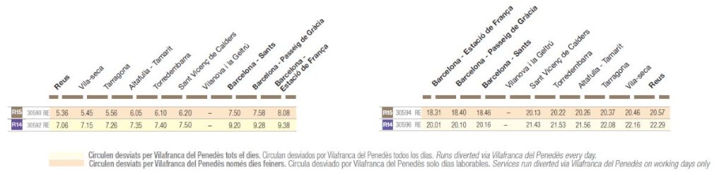 R14-R15 Durante los días laborables, dos trenes por sentido se desvían por Vilafranca del Penedès.