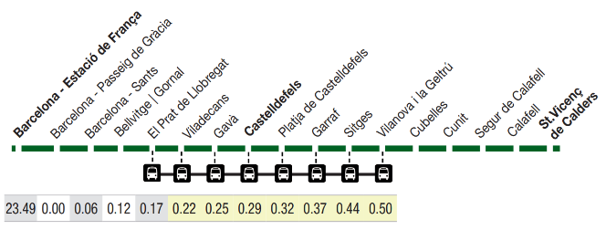 - Tramo Barcelona – Castelldefels: 6 trenes por hora y sentido