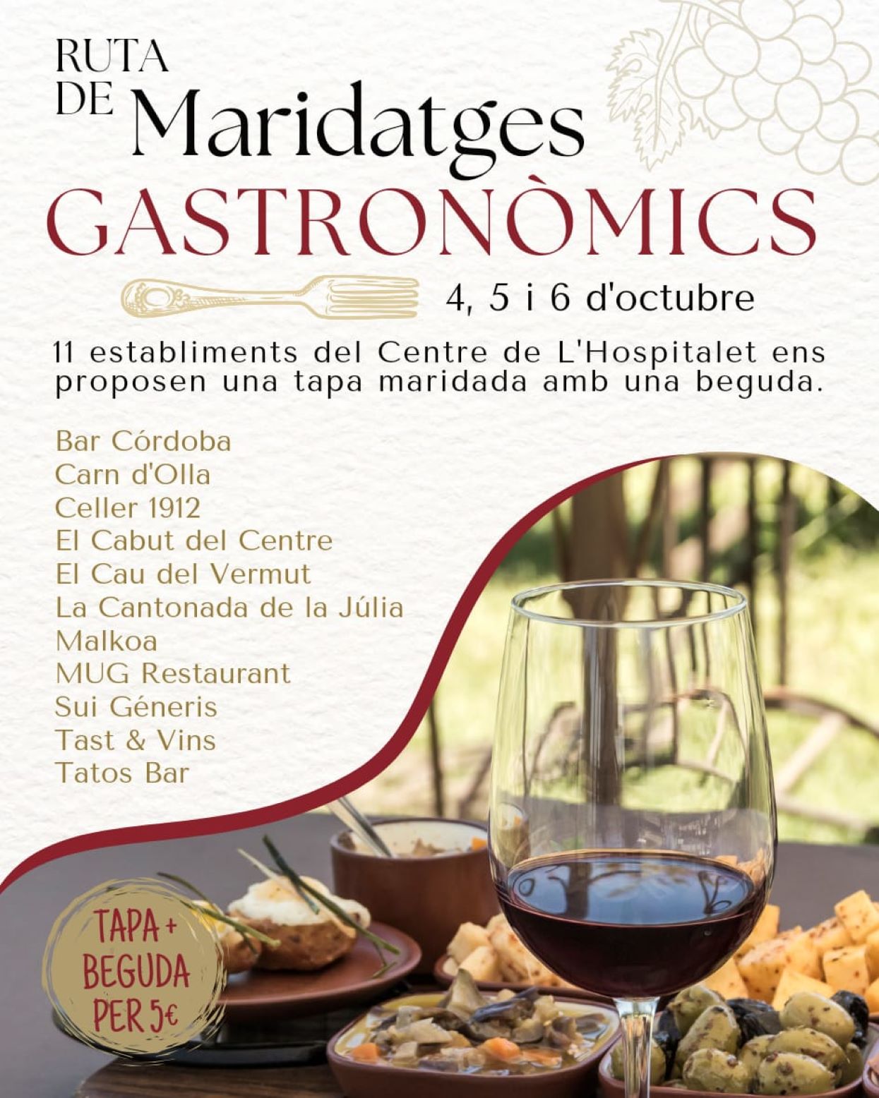 Once establecimientos gastronómicos de L’Hospitalet, han preparado una Ruta de Maridatges Gastronómicos que se celebrará los días 4, 5, y 6 de octubre. Una oportunidad excelente para disfrutar de la buena gastronomía que se cuece en la ciudad.